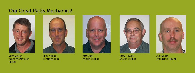 There are just five full-time mechanics in the Operations department who are based at four different parks. John Zinser is at Miami Whitewater Forest, Tom Woods and Jeff Dion are at Winton Woods, Terry Howell is at Sharon Woods and Alex Baker is at Woodland Mound. In addition to their home park and golf courses, they are also responsible for vehicles and equipment from nearby parks as well as other departments.