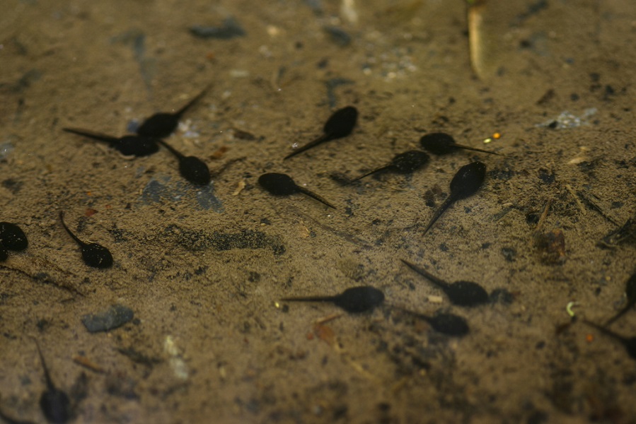 Both species coexisted together sharing lettuce and goldfish flakes. The frogs, being a few weeks older, were the first to sprout their back legs. Once this was accomplished, the rest of the metamorphosis happened rather quickly. Front legs developed, the tails began to shrink and one morning the first tiny froglet was perched on a rock inside the exhibit. It was clear at this point that these were, in fact, wood froglets. Other tadpoles quickly followed in becoming froglets, and then it was the toads turn to begin metamorphosing. Jet-black tadpoles grew legs and lost their tails in just a few days, and began hopping around on the rocks. As they grow, the froglets and toadlets become insectivorous. It has been difficult to get them to eat in captivity, so as soon as they are hopping around on the rocks and breathing with newly developed lungs, they will be released back to the vernal pools where they were originally collected.