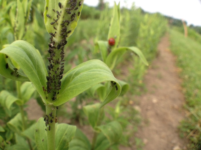 The picture shows colonies of aphids forming in royal catchfly (Silene regal) – note the already curled leaves! In the background, a lone ladybug is going to work. After this photo was taken, more ladybugs appeared and the colony was destroyed. What a great ally for the nursery!