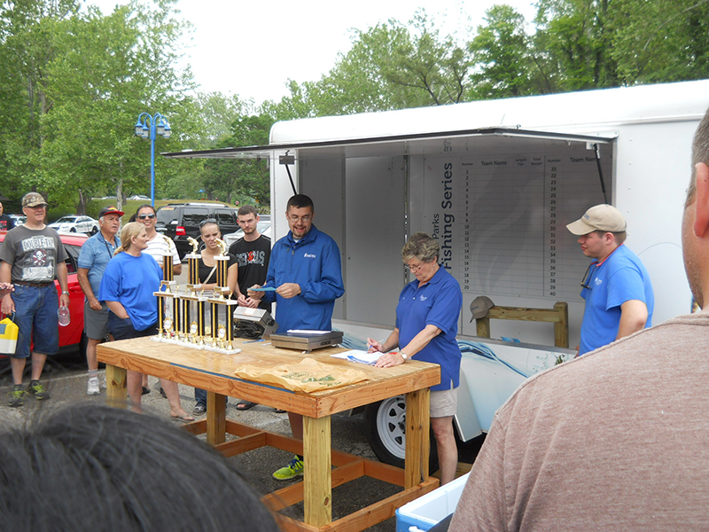 Kids weighed in their fish periodically throughout the event, hoping that theirs weighed the closest to the “mystery weight.” At noon the air horn was blown to signal the end of the tournament and that no more fish could be weighed. As the Lake Isabella staff diligently went through all of the weights to figure out who was the closet for each age category, Bass Pro Shops hats and cups were given away to participants.