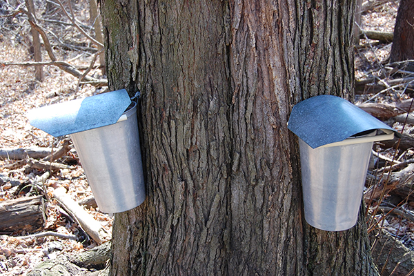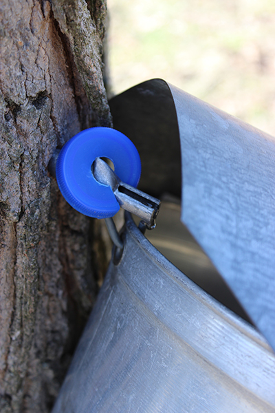 It starts with a ray of light from the sun hitting the leaf of a sugar maple tree (Acer saccharum). The energy from the sun breaks apart a water molecule and a carbon dioxide molecule, and long story short, the end result of this process is oxygen and sugar. The oxygen is sent back into the air we breathe. The sugar is sent into the tree’s sap to be used later for the tree’s growth. In the fall, the sap is pulled down into the roots to be stored for next year’s growing season. In late winter, when temperatures are above freezing during the day and below freezing at night, the sap flows back up and down through the tree’s vessels. Drill a hole in the side of the tree, insert a spile and watch the sap flow into your bucket.