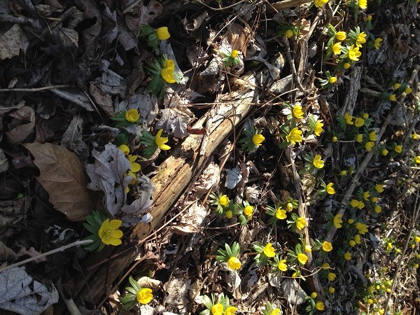 Winter aconite, a non-native flower in the buttercup family, spreads across the forest floor at Embshoff Woods.