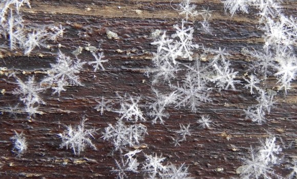 Formation of the snowflake begins aloft, way above the earth’s surface. It takes a very cold water droplet sticking to a particle of dust or pollen to begin the creation of a snowflake. As this tiny ball descends slowly to earth, water vapor freezes to the water and dust. Like magic, six arms are formed. The truth behind the magic is the crystallization. Crystallization is when water follows a pattern by filling in pre-determined spaces between molecules, thereby creating a six-sided snowflake every time. (This still sounds like magic to me!)