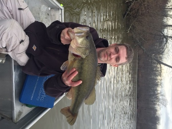 • Justin Tanner from Fairfield, Ohio, caught this 7 pound large mouth bass at Miami Whitewater Forest Lake. He caught it on a minnow while crappie fishing. 3/7/16