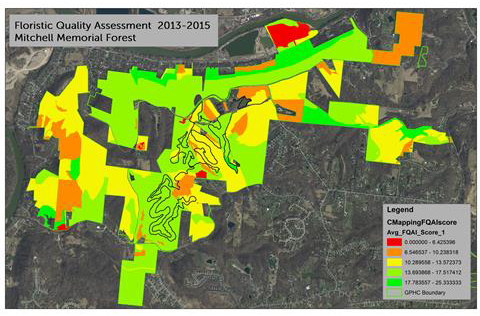 Once we know which plant species are in each plot, we can calculate the plot’s FQAI score and average those scores across different habitat types. Below is an example from Mitchell Memorial Forest. The darker green indicates areas that contain plant species less likely to be found in other habitats, while red areas have plant species that are very common or even weedy.